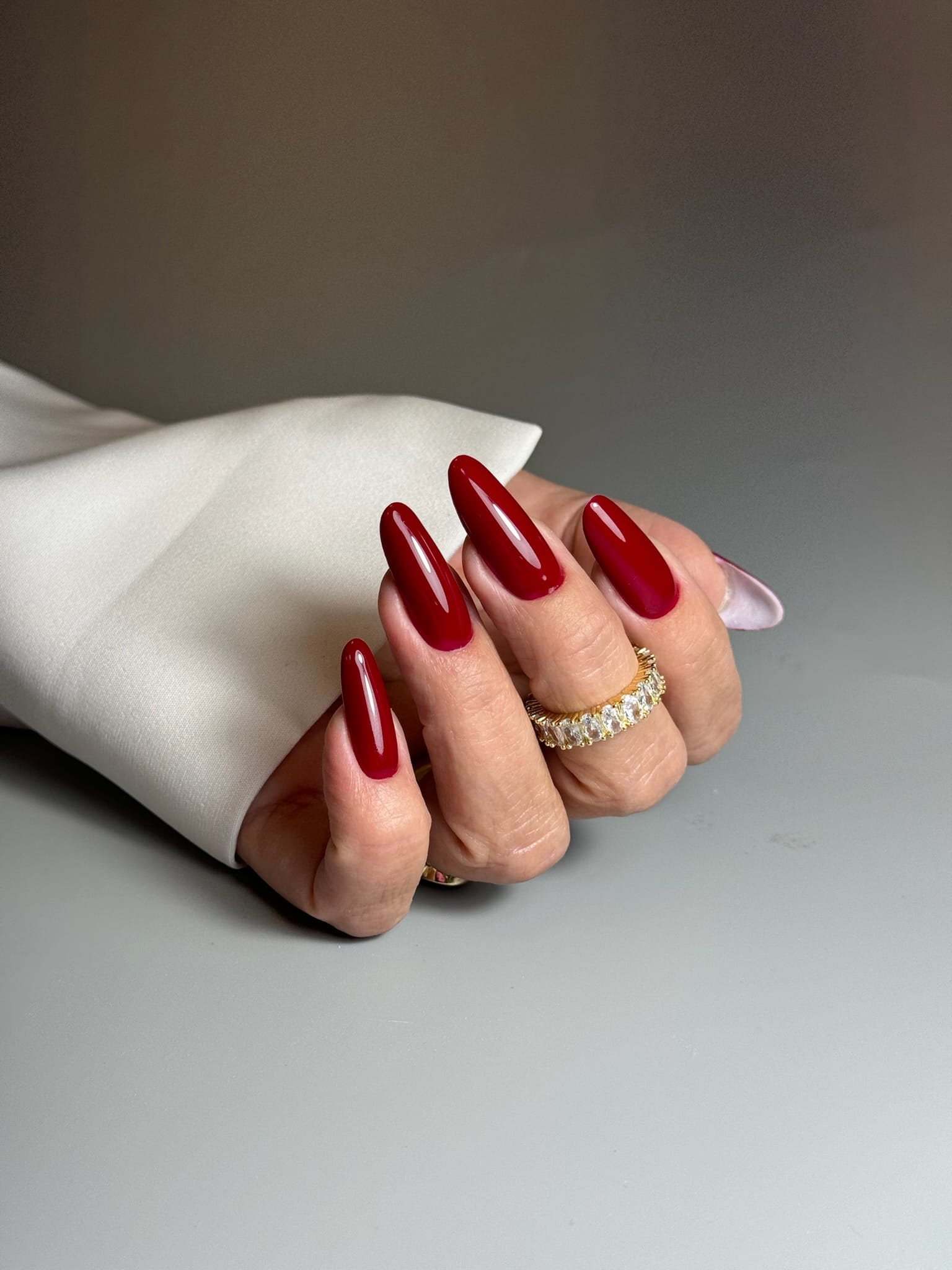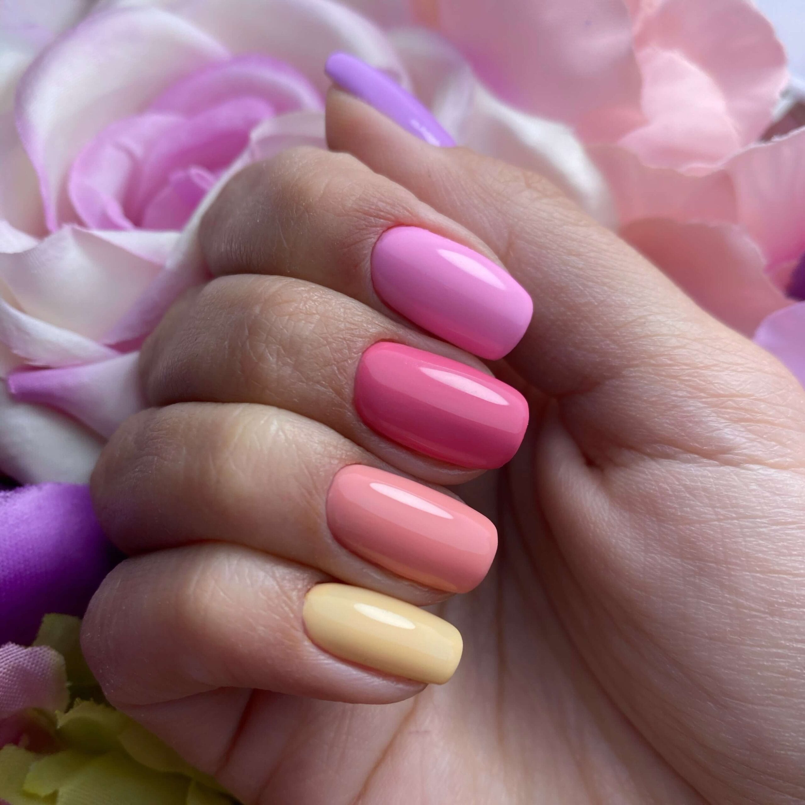 Opracowywanie skórek, jednolite cięcie nożyczkami/ cążkami, praca frezarką od podstaw. Stylizacja wykonana bazą hybrydową i malowanie kolorem z zachowaniem linii światła.